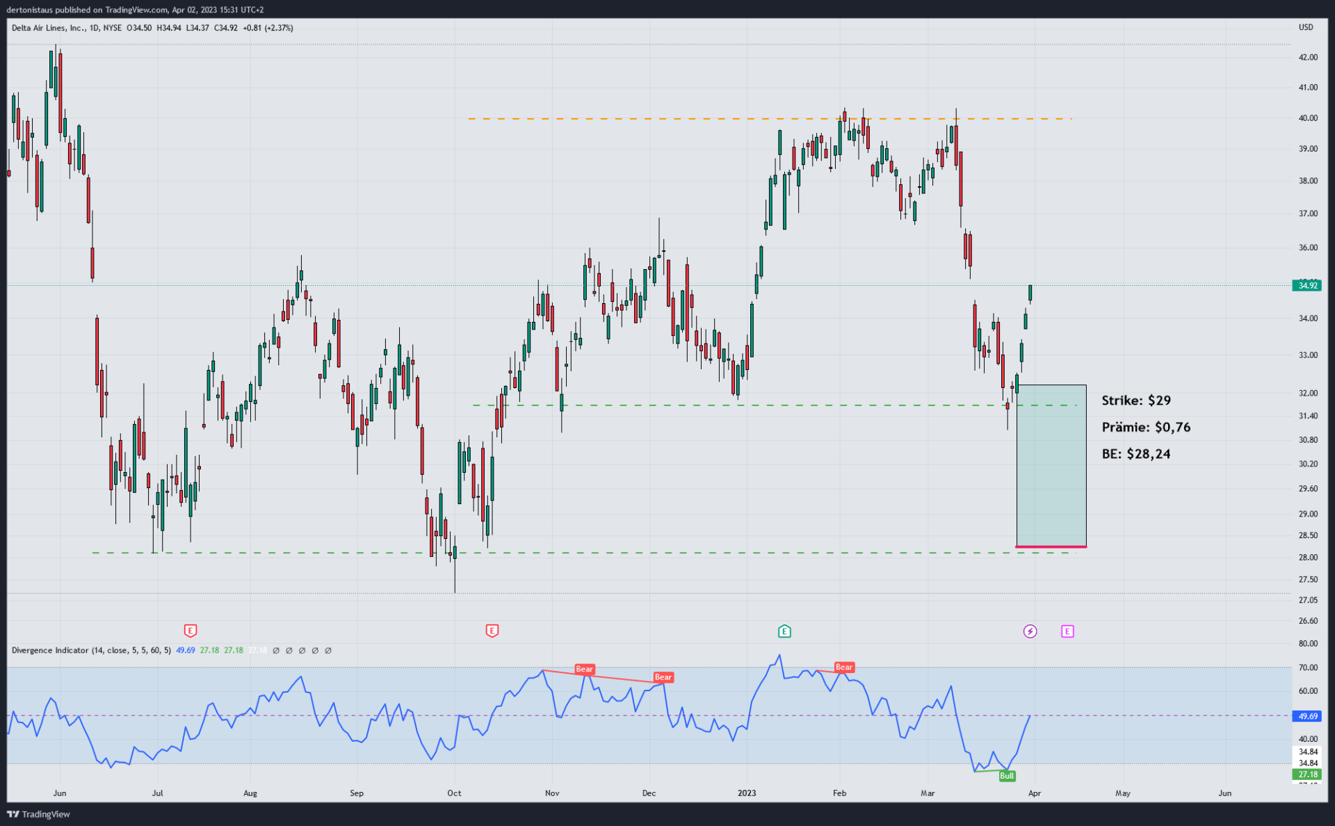 #1 Trade closed: Heute (11.04.2023) konnte ich kurz nach der Börseneröffnung den Short Put auf GDX für $0,30 zurückkaufen. Macht vor Steuern und Gebühren einen Profit von $55. Im Laufe des Tages habe ich auch die Position DAL geschlossen. Hier habe ich die Option für $0,29 gekauft. Der Profit beträgt $47. Die Optionen habe ich zwei Wochen gehalten. Damit ergibt sich eine annualisierte Rendite von ca. 40%.