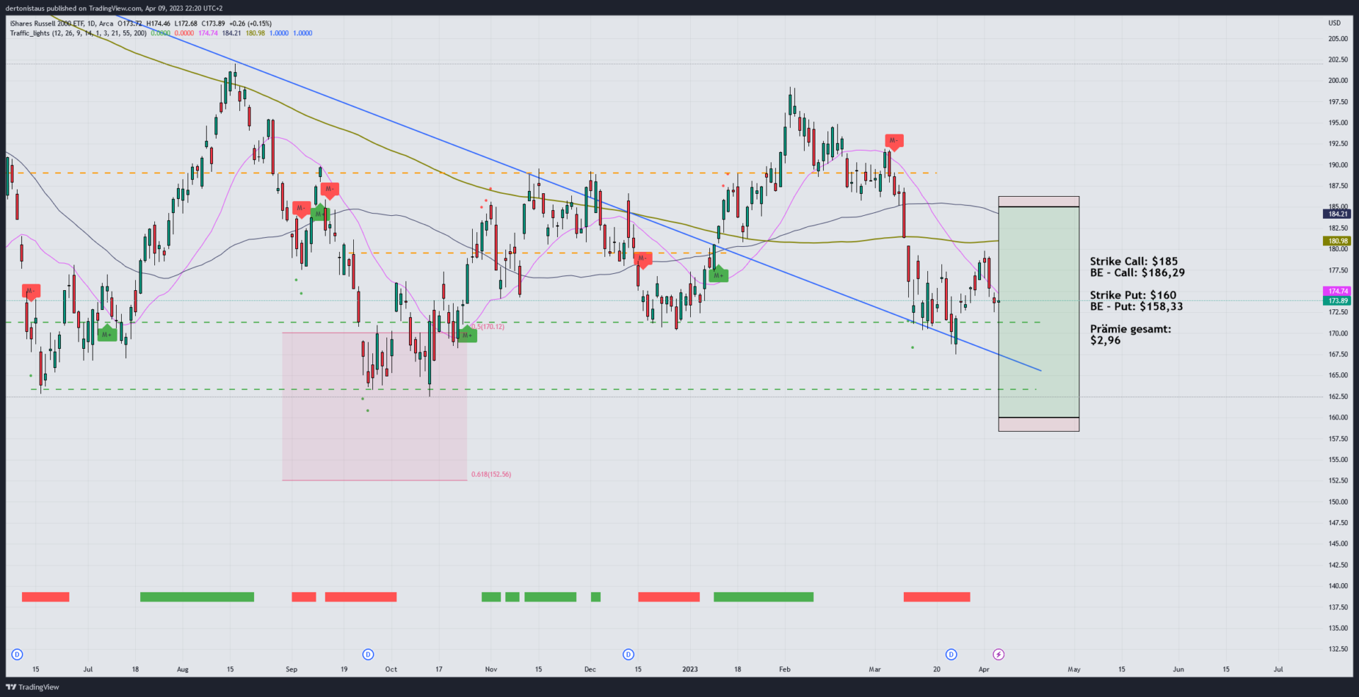 Am 06.04.2023 habe ich einen Short Strangle im IWM aufgesetzt. Das ist der ETF von IShares auf den marktbreiten Index Russell 2000. Die Werte im Russell 2000 sind Nebenwerte, die zinssensibel reagieren. Aus meiner Sicht hat dieser Index eine deutlich größere Aussagekraft in Bezug auf die wirtschaftliche Situation in den USA. Mit etwas Fantasie kann man hier auch von einem vorlaufenden Indikator gegenüber dem SPX sprechen, der wiederum durch die Big-Tech-Aktien positiv notiert. Wenn wir beim Russell 2000 bleiben, lässt sich seit Jahresbeginn keine nennenswerte Kurssteigerung erkennen und das hat die o.g. Gründe, hohe Zinsen, Inflation und rückläufige Gewinne. Der Kursverlauf ist demzufolge ideal für neutrale Optionsstrategien.