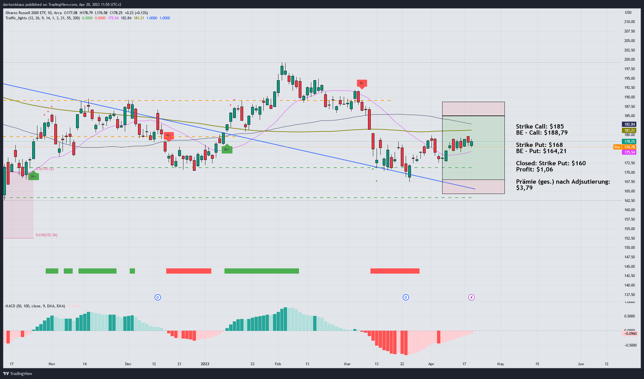 Am 06.04.2023 habe ich einen Short Strangle im IWM aufgesetzt. Das ist der ETF von IShares auf den marktbreiten Index Russell 2000. Die Werte im Russell 2000 sind Nebenwerte, die zinssensibel reagieren. Aus meiner Sicht hat dieser Index eine deutlich größere Aussagekraft in Bezug auf die wirtschaftliche Situation in den USA. Mit etwas Fantasie kann man hier auch von einem vorlaufenden Indikator gegenüber dem SPX sprechen, der wiederum durch die Big-Tech-Aktien positiv notiert. Wenn wir beim Russell 2000 bleiben, lässt sich seit Jahresbeginn keine nennenswerte Kurssteigerung erkennen und das hat die o.g. Gründe, hohe Zinsen, Inflation und rückläufige Gewinne. Der Kursverlauf ist demzufolge ideal für neutrale Optionsstrategien.