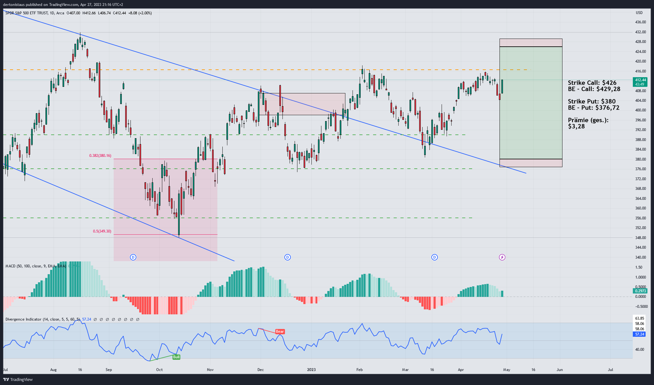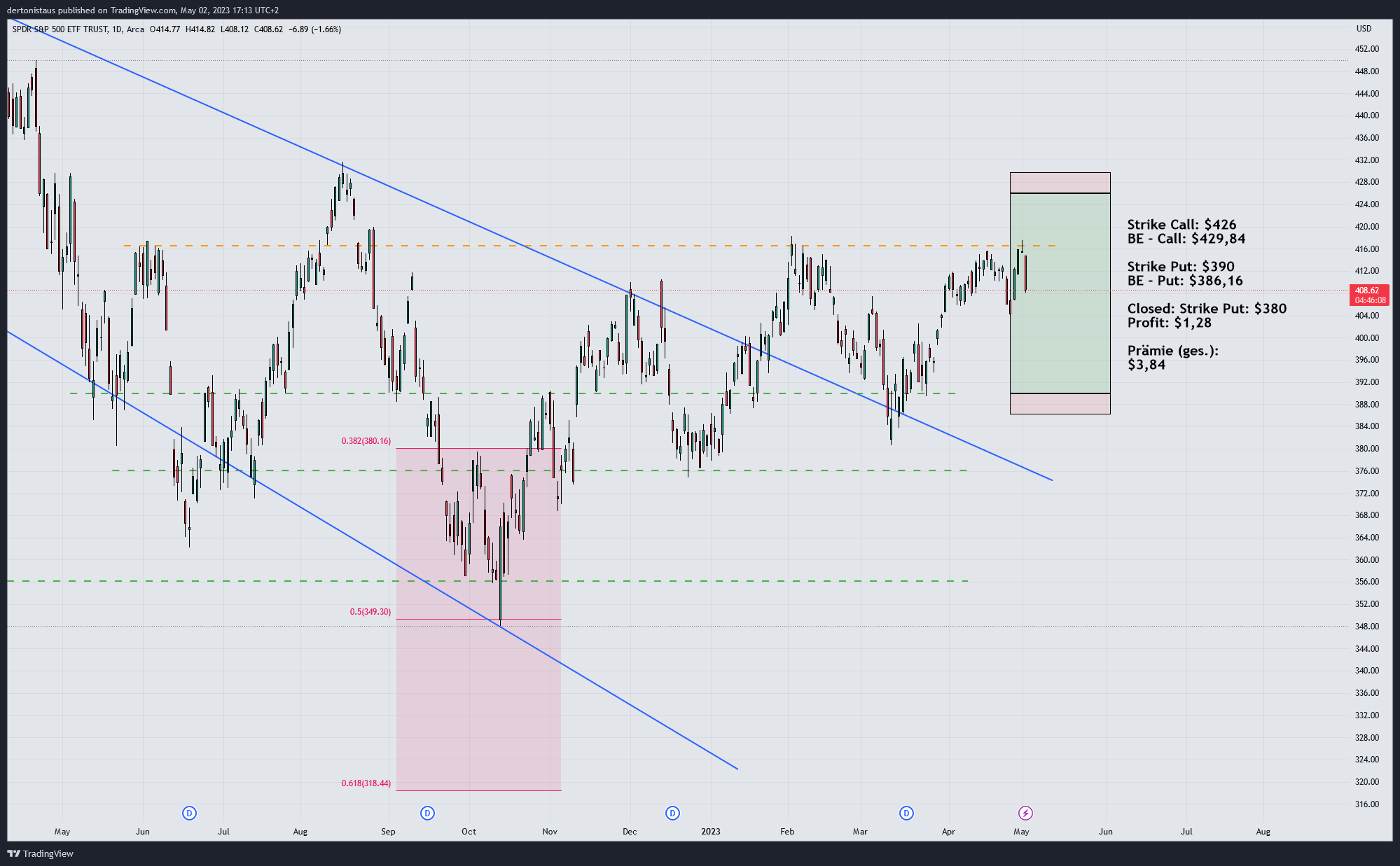 #1 Trade adjustiert (02.05.2023): Gestern (01.05.2023) habe ich den Trade etwas an die Situation angepasst. Der SPY hatte nach einem kleinen Aufwärtsschub meinen Put auf der Unterseite stark verbilligt. Der 380er Strike wurde nach oben gerollt. Der neue Strike liegt bei $390. Einen Tag später weiß ich, es war kein gutes Timing. 😉