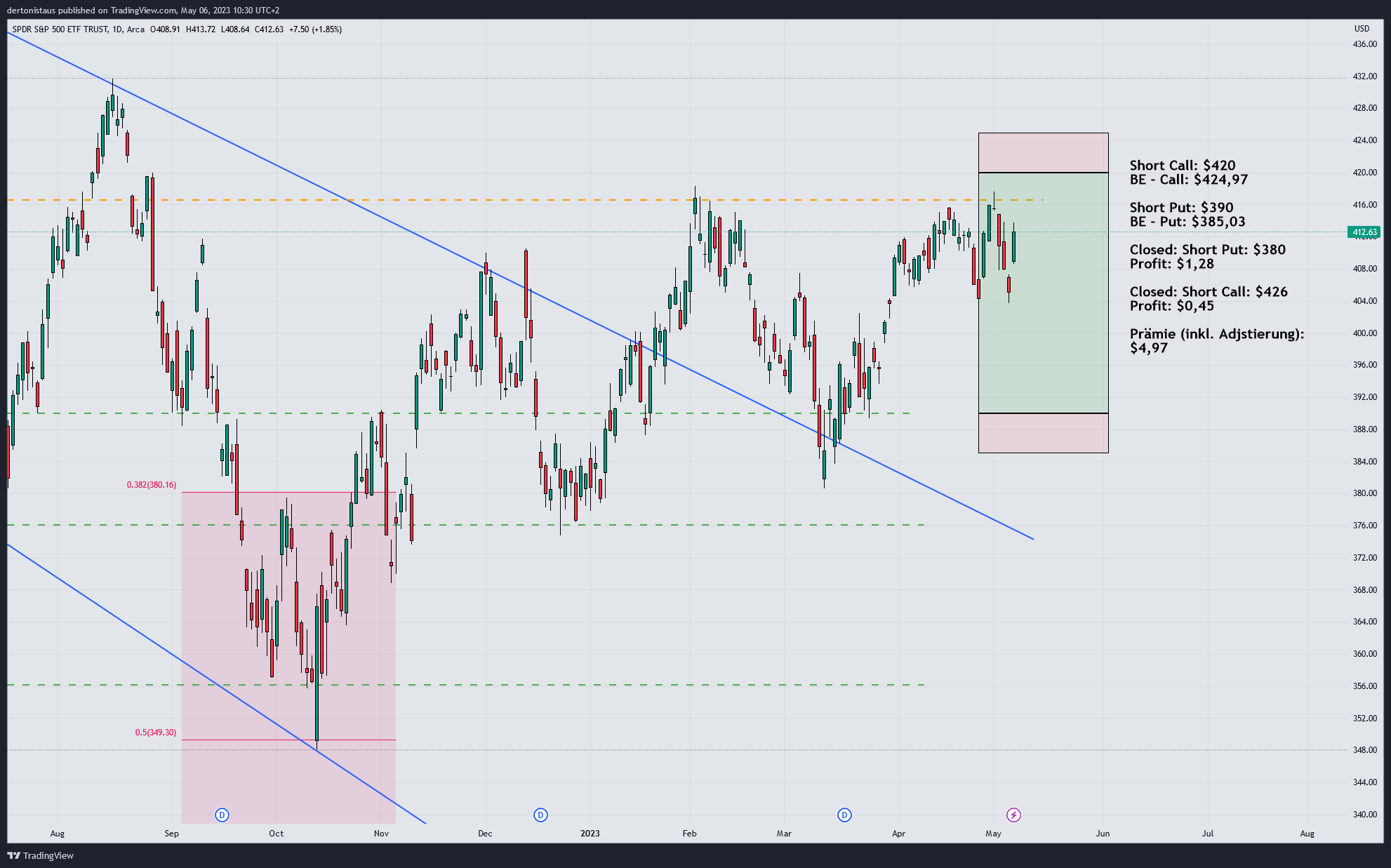 #2 Trade adjustiert (06.05.2023): Ein Auf und Ab der Gefühle nach einer bewegenden Woche. Am 04.05.2023 habe ich auf der Oberseite den Call von $426 auf $420 gerollt. Wieder einmal habe ich mich für den Weltmeistertitel im Timing beworben. Die Adjustierung war notwendig geworden, um das Delta der Position anzupassen. Der 426er-Call wurde für $0,70 zurückgekauft. Der neue Call am Strike $420 brachte eine Prämie von $1,83. Aufgrund der gestiegenen impliziten Volatilität ein lohnendes Geschäft.