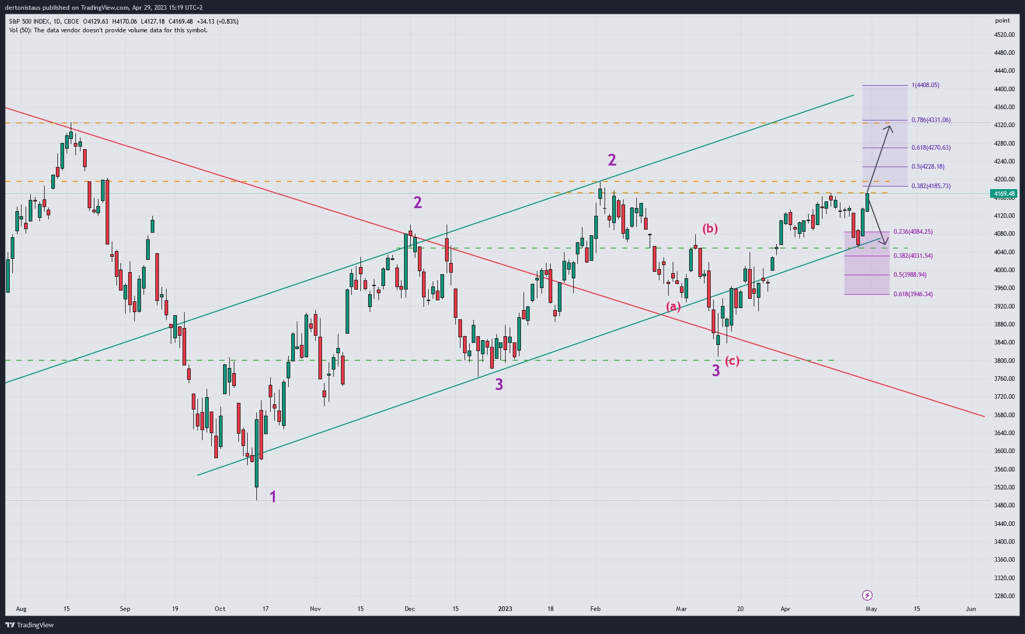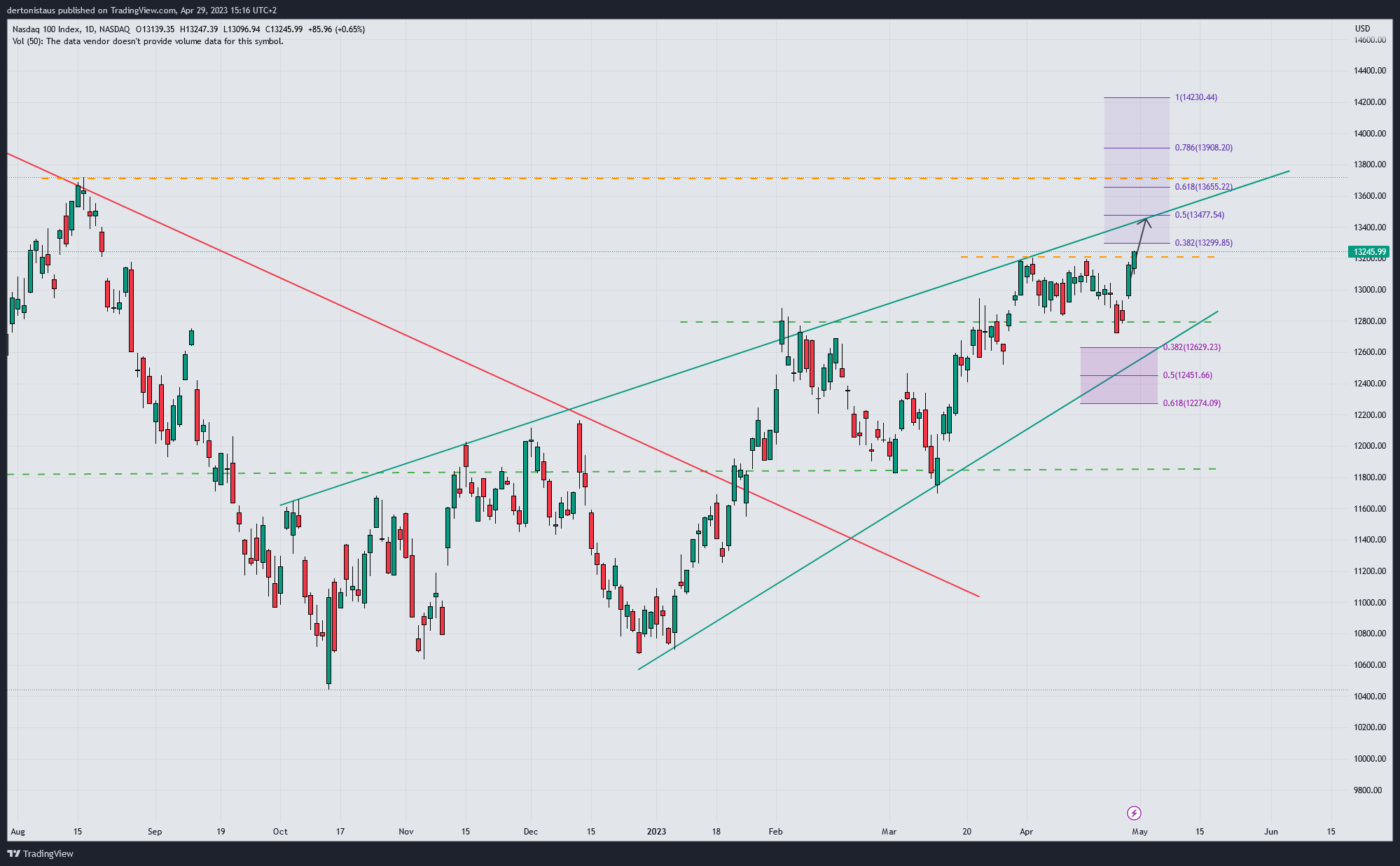 Auf der anderen Seite überzeugt die aktuelle Berichtsaison. Die Quartalsergebnisse der großen Tech-Unternehmen (MSFT, AMZN, META und GOOGL) waren fast durch die Bank weg positiv bzw. besser als erwartet. Das hat den Markt beflügelt. Der NDX konnte eine Wochenperformance von mehr als 2% hinlegen.