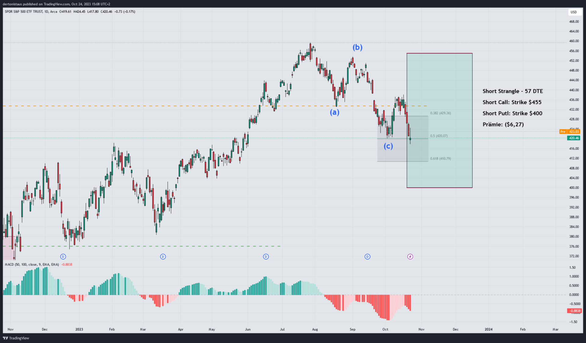 Im Chart lässt sich die Korrektur sehr gut erkennen. Sie folgt derzeit einer ABC-Struktur mit einer starken Unterstützung bei der Marke von $420. Sollte diese Marke nachhaltig unterschritten werden, z.B. durch eine Wochenkerze, dann besteht hier ein größeres Abwärtspotenzial. Auf der anderen Seite hat der Chart auch die Chance, einen Boden an dieser Marke auszubilden und die Jahresendrallye einzuleiten. Die wichtigen Impulse werden vermutlich in dieser Woche (KW43) kommen. Wichige Inflationskennzahlen und Quartalsergebnisse, die den Markt nachhaltig beeinflussen können, stehen vor der Tür. Den Anfang machen heute Abend Microsoft (MSFT) und Google (GOOGL).