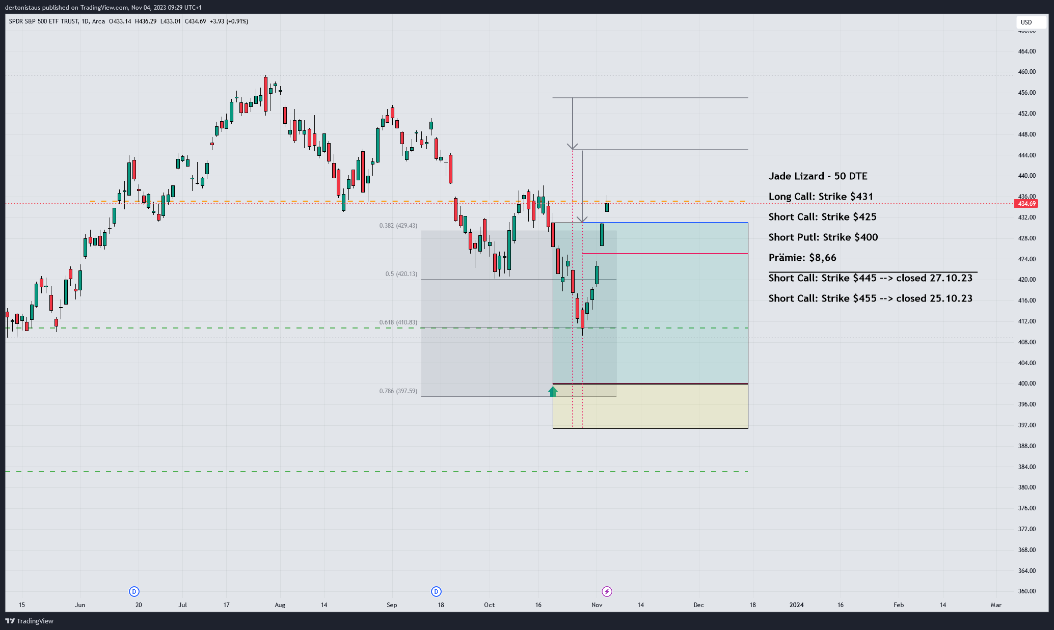 Im Anschluss ist der S&P 500 weiter gefallen. Daraufhin habe ich mich für eine weitere Anpassung entschieden, da der RSI am 27.10. mittlerweile einen Wert von <30 angenommen hatte. Um nicht von einer starken Gegenbewegung überrascht zu werden und den Trade auf der Oberseite mit Verlust zu schließen, wurde der 445er Call nochmals nach unten gerollt und gleichzeitig habe ich einen Put zur Absicherung gekauft. Der Bear Call Spread wurde mit den Strikes $425/$431 verkauft und generierte eine weitere Prämieneinnahme. Diese Konstellation wird auch als Jade Lizard bezeichnet. Die gesamte Prämie (nach allen Adjustierungen) liegt nun bei $8,66.